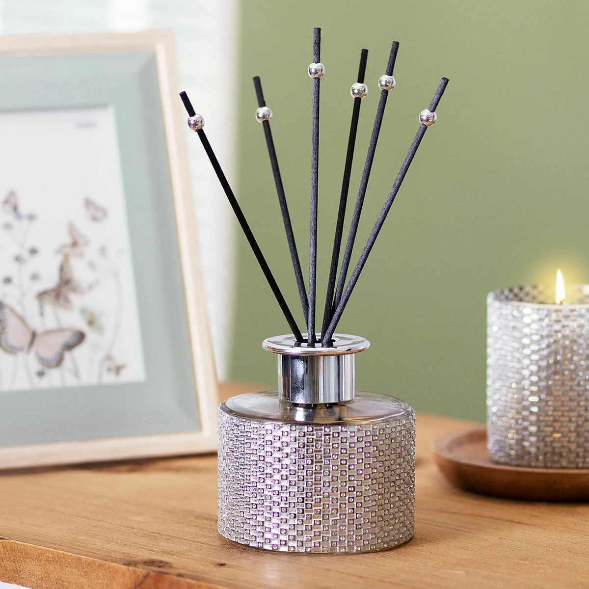• Elevate your home ambiance with the Desire Silver Diamante Pomegranate Noir 200ml Reed Diffuser. Perfect for creating a sophisticated and inviting atmosphere.