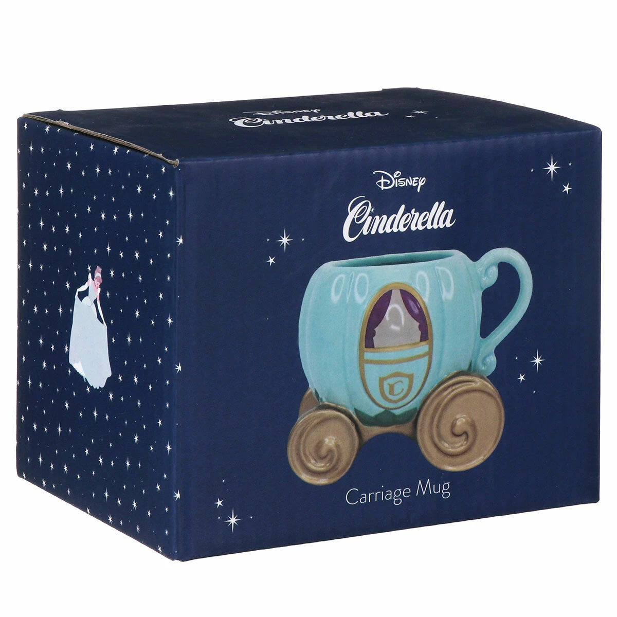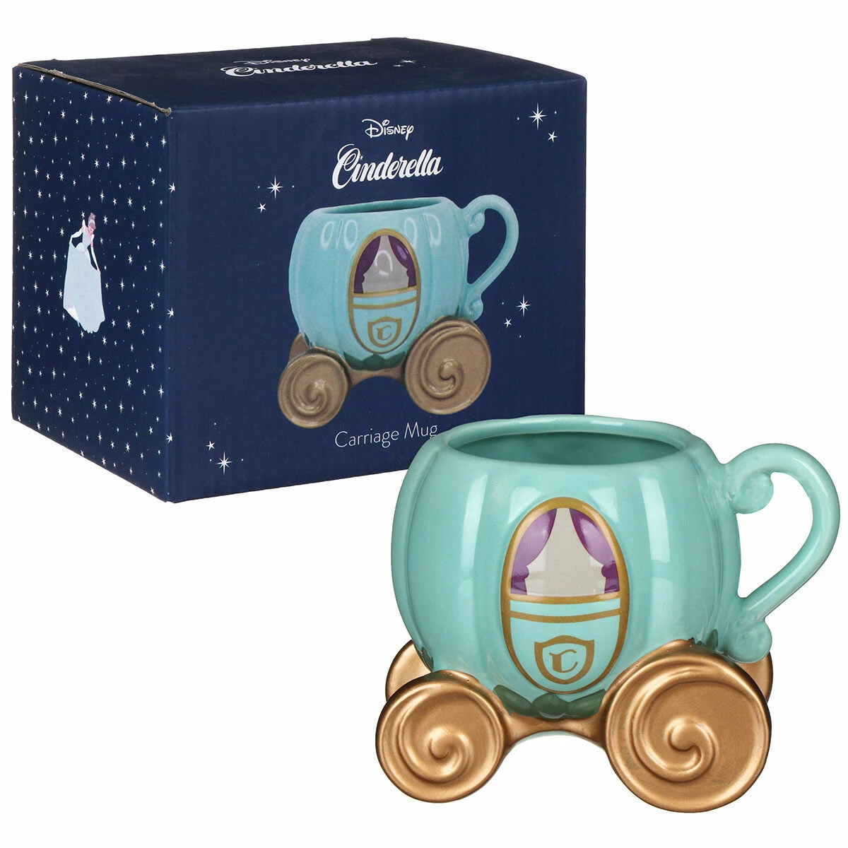 This fun and quirky porcelain mug is made to look like Cinderella’s carriage from everyone’s favourite Disney Princess film, Cinderella. It is perfect for tea, coffee and hot chocolate drinkers! The mug is a light turquoise colour with golden wheels and a gold detailing, complete with a small handle!