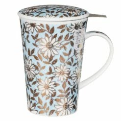 Featuring an intricate floral design by Jane Fern, this elegant cup is white with a mottled blue background. The flowers and foliage are drawn in 22 carat gold leaf, adding a touch of luxury. The inner rim of the mug is lined with flowers while the design continues across the lid and the handle. A lovely gift for Christmas or birthday gift for your loved ones to enjoy their favourite loose leaf tea for the perfect morning or a cosy evening.
