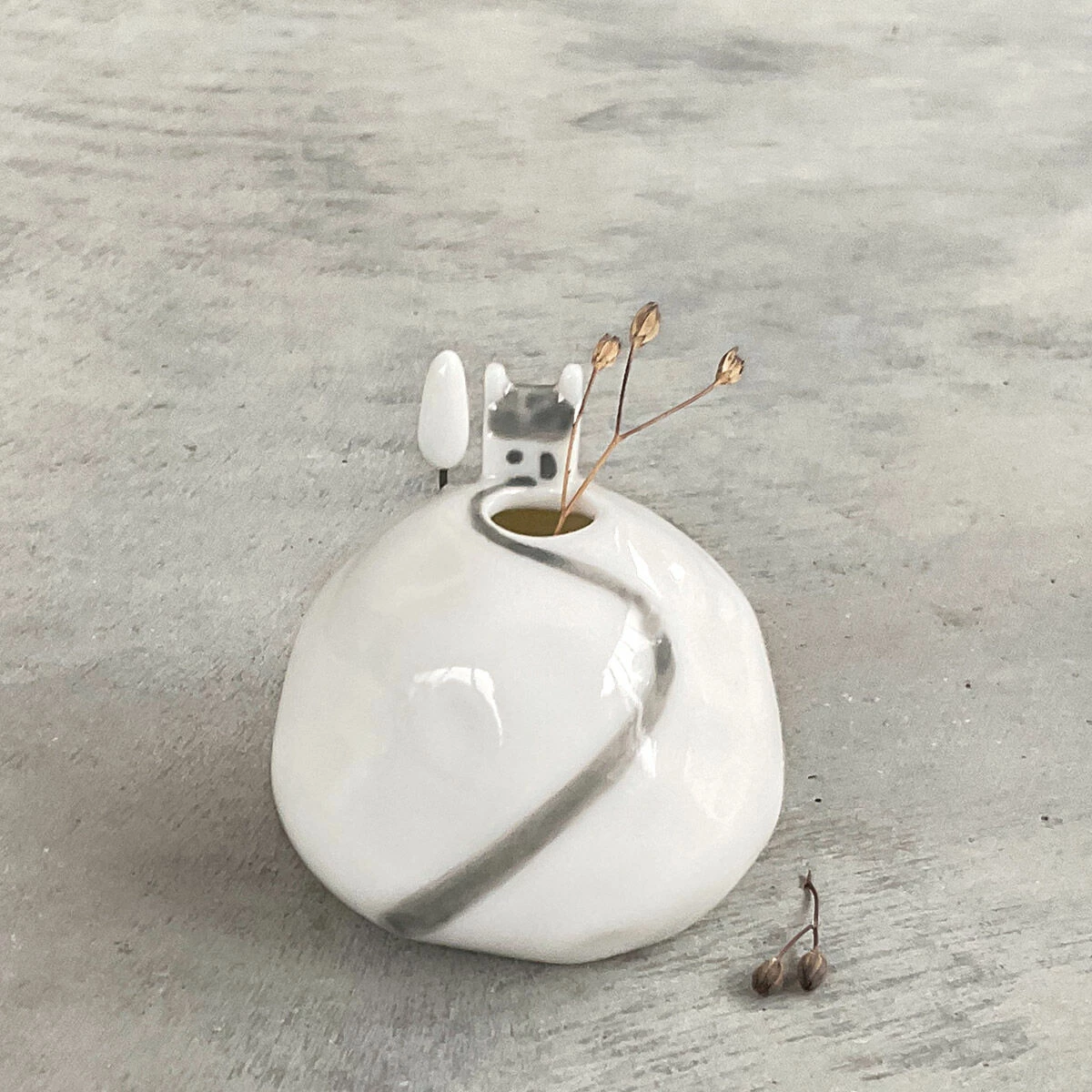 Made from crisp white porcelain with a clear gaze, the vase has been made into a round shape with a small house and tree sat on top with a winding grey driveaway leading to the front door. At the top of the vase is a small round hole, perfect for a single flower or small bunch of small flowers.