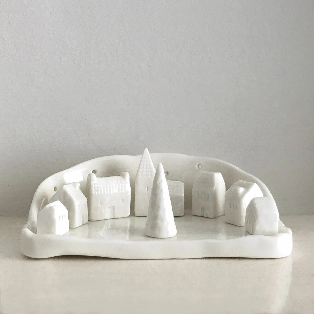 The wonderful white porcelain has been carved and shaped to create an array of different houses, a Christmas tree and a church, all sat on a white porcelain base which presents the porcelain delightfully as a quaint village.