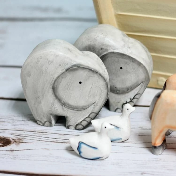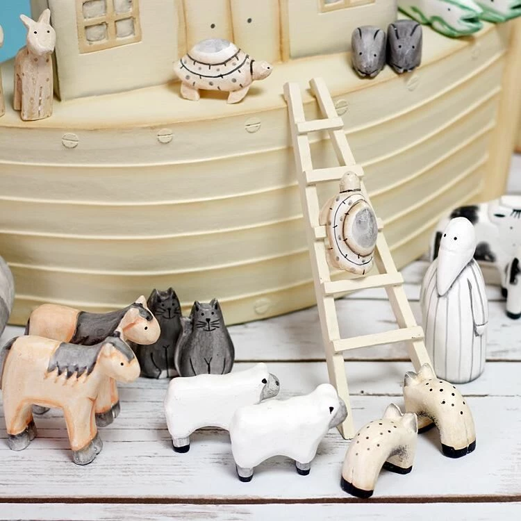 The wooden box which accompanies the ark is painted in matching soft tones of cream and ochre, the lid fits snugly and has a pattern of pale polka dots and a cream-painted plaque, which is carved with the words Two by Two and a tiny heart. The lid lifts off to reveal a partitioned interior, with shredded brown paper to emulate the straw which the animals are using for bedding. There are elephants, giraffes, cows, leopards, geese, pigs, cats and crocodiles, turtles, sheep and horses, all nestled together and all carved and painted in an endearing naïve style with soft colours and simple contours. Noah himself is carved with the simplicity of a Nordic sculpture, with a pointed beard and a hint of indentation suggesting a moustache, above which two dots for eyes give him a slightly bemused expression. The final piece is a primitive A-frame ladder, by which the animal passengers enter the Ark, Two by Two.