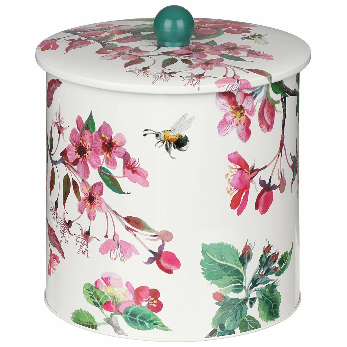 This cylindrical tin is decorated with the stunning Blossom design with branches full of luscious pink blossom flowers and lush green leaves. Adorable little bumblebees are illustrated fluttering from flower to flower, their yellow and black colourings contrasting beautifully with the colour scheme of pinks and greens. The barrel is a soft cream in colour, creating a wonderful base for the design.