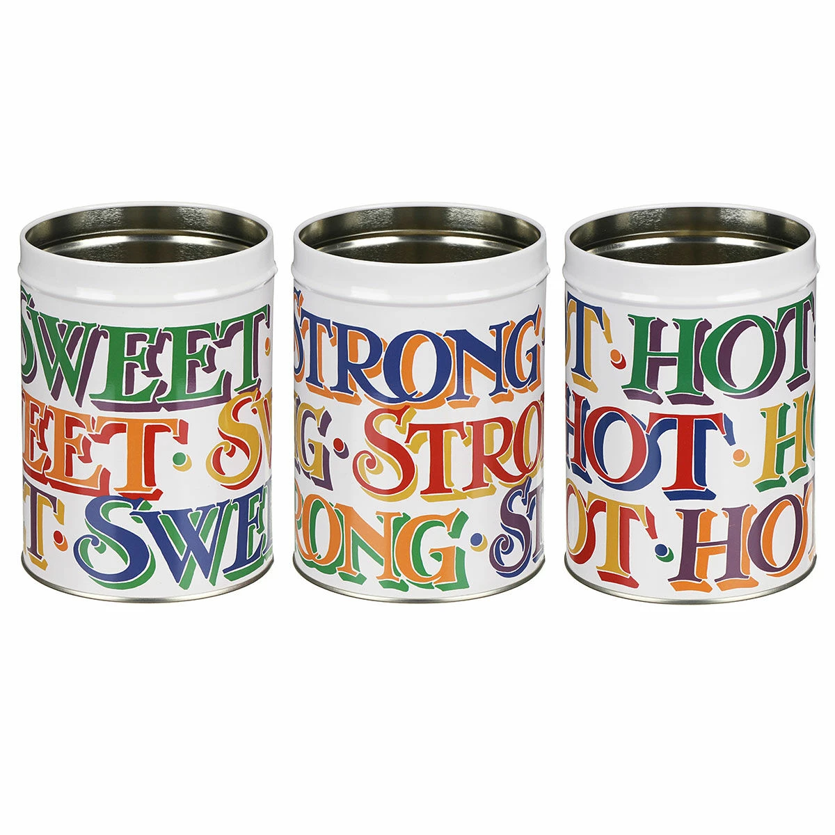 There are three different tins with unique designs, each featuring the stylish Brighter World text repeatedly printed in a range of bold and bright colours. The first tin is printed with the phrase ‘STRONG’, the second reads ‘SWEET’ and the third says ‘HOT’. The designs are scattered across a cream background allowing the patterns to stand out and create a striking look perfect for any kitchen.