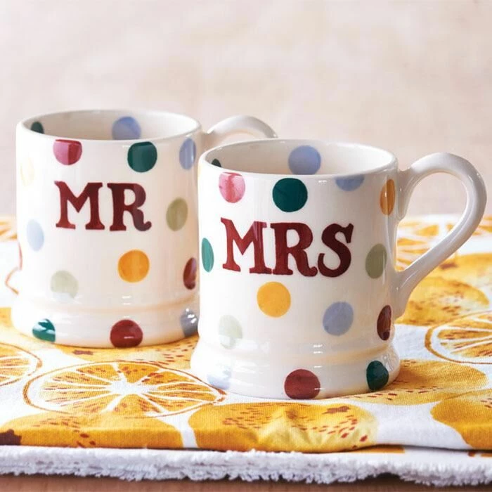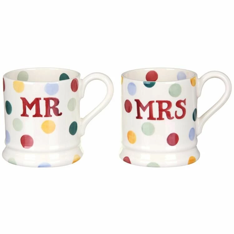 Celebrate and commemorate the marriage of two special people in your life with this beautiful set of Mr & Mrs Boxed Half Pint Mugs, part of the popular Polka Dot range from Emma Bridgewater.