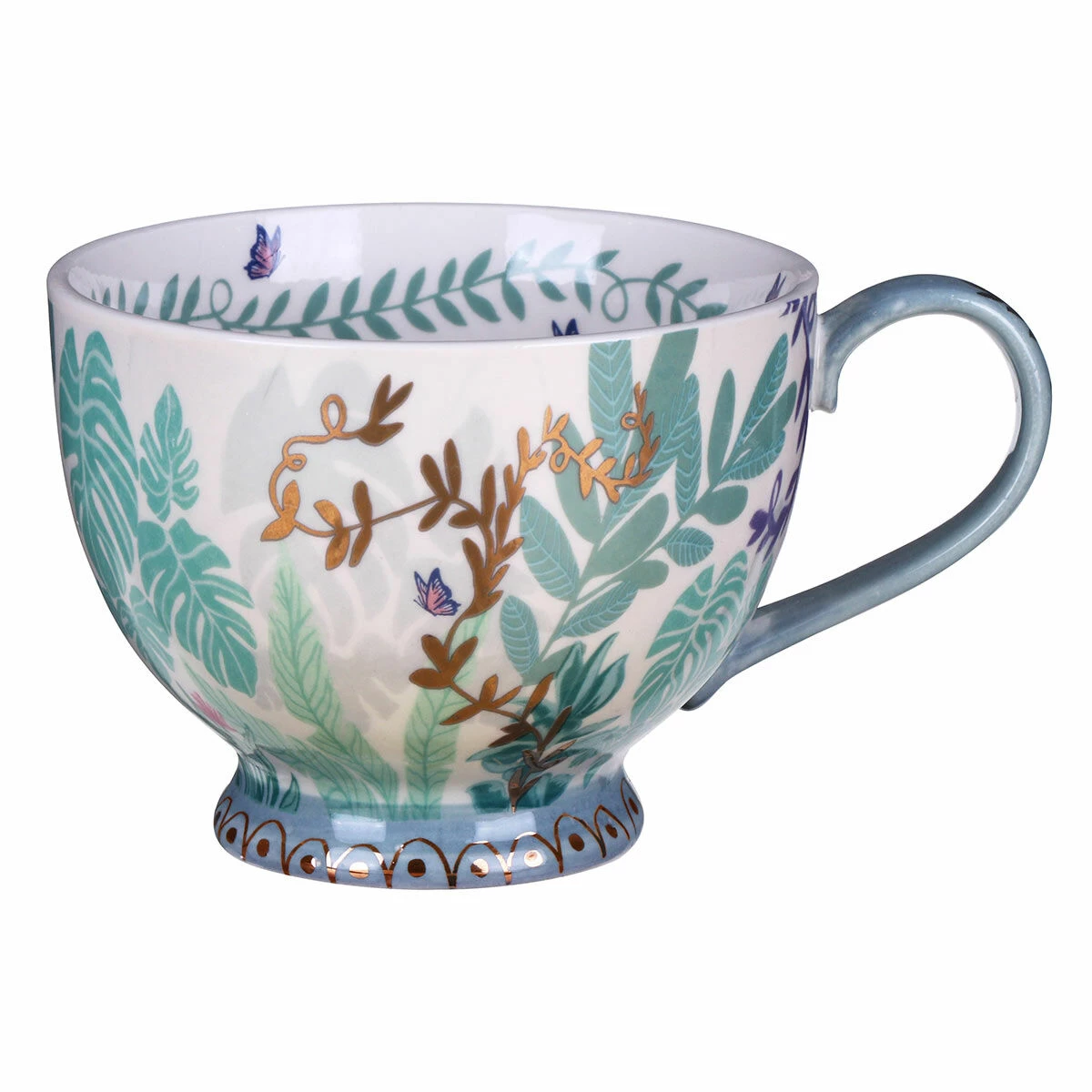 This gorgeous cream teacup is decorated with delicate paintings of leaves, butterflies and gold foil plants twisting around the sides of the cup. The base is a beautiful pastel blue colour with shiny gold detailing that matches the handle. Inside the teacup is an adorable black and white cat curled up, waiting to be seen once you finish your drink.