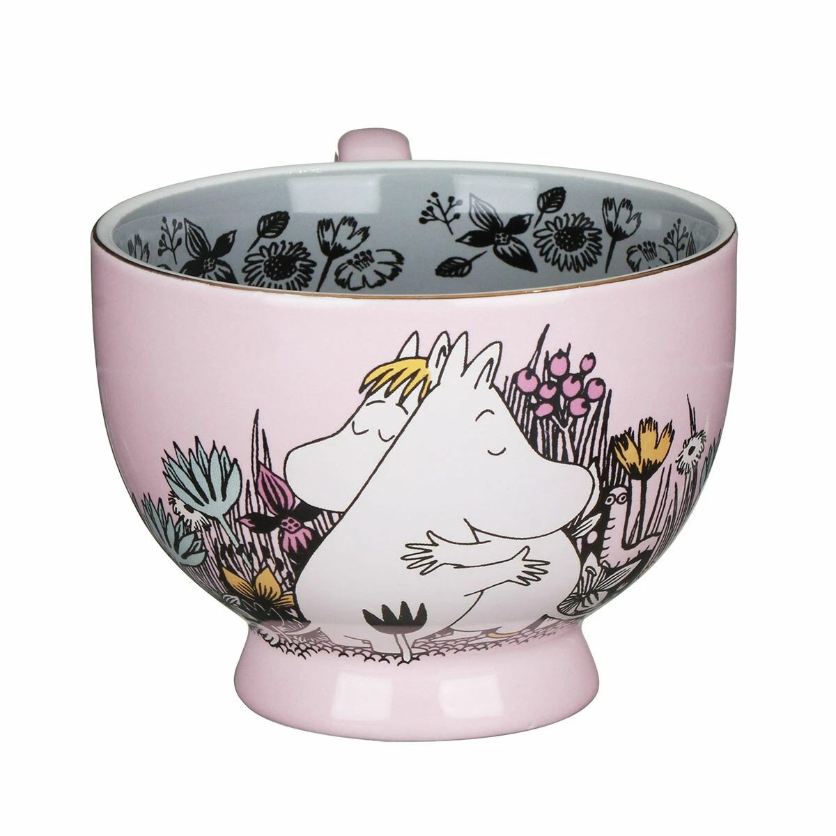 This stunning bowl is decorated with the Moomin ‘Love’ design which features Moomin and his friend Snorkmaiden standing in a meadow embracing in a hug. The design is set against a pale pink background and the interior contrasts in pale grey. In the bottom of the mug is a 3D figurine of Moomin and Storkmaiden and the inner rim of the bowl features an illustrated floral motif waiting to be seen once you finish your drink. This stylish Moomin ceramic bowl is finished with a gold edge which gives it a luxury feel.