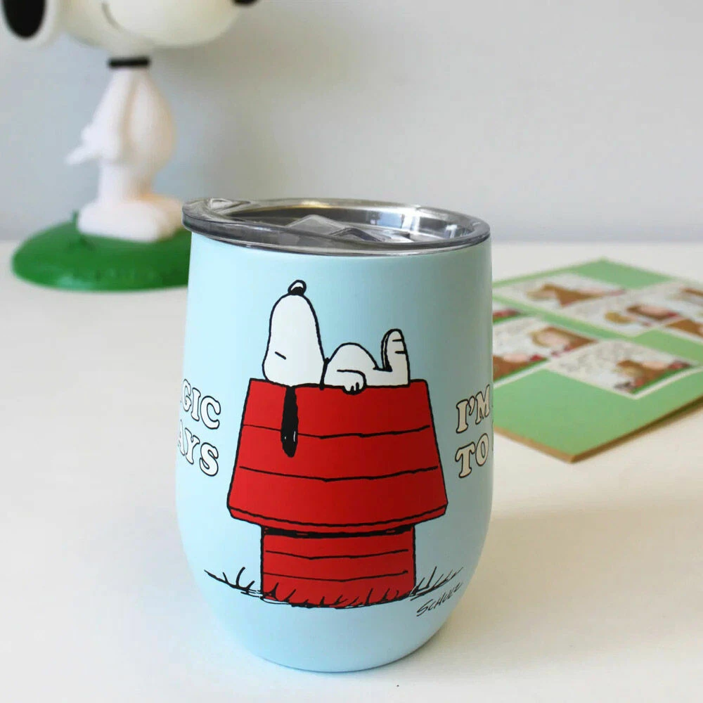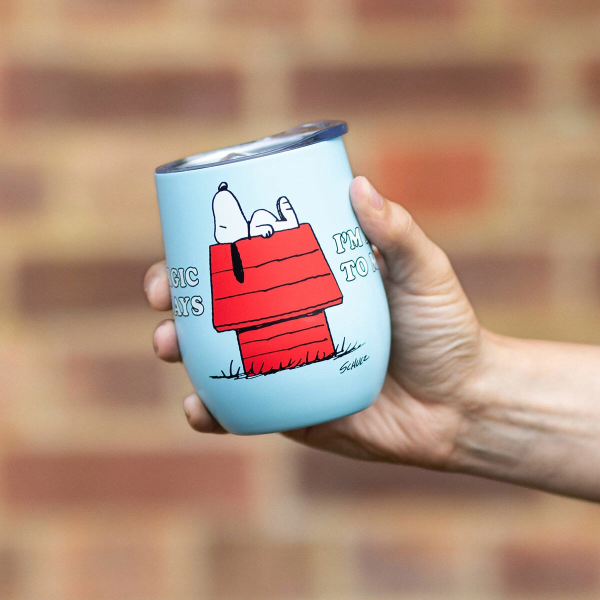 The body of the tumbler is decorated with a classic illustration of Snoopy lying on his back on the roof of his red kennel. The design is set against a pale blue background representing the sky and is complete with the phrase ‘I’m allergic to Mondays’ written either side in a bold uppercase font. The transparent lid contrasts the colour scheme and simply pushes into place. With a capacity of 350ml, it is ideal for your daily caffeine fix on the way to work, or a cheeky gin when you’re having a picnic. Thanks to its thermal insulation this travel cup is perfect for keeping hot drinks hot and cold drinks cold!