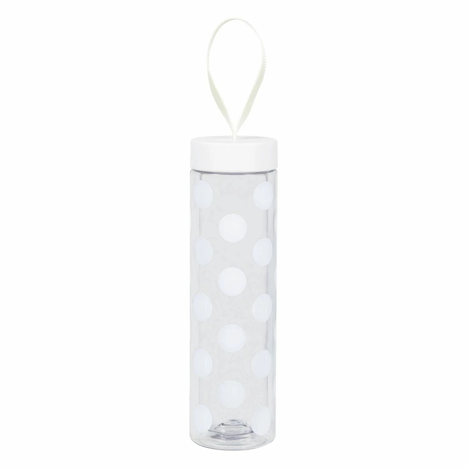Featuring a white screw top lid with a matching carry strap, this bottle is perfect for carrying around or popping in your handbag. The bottle is decorated with the Jumbo Dot pattern of large white dots on a transparent background.