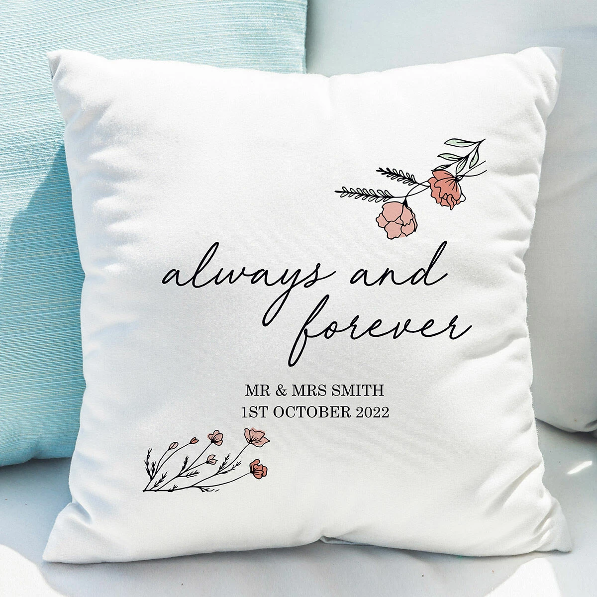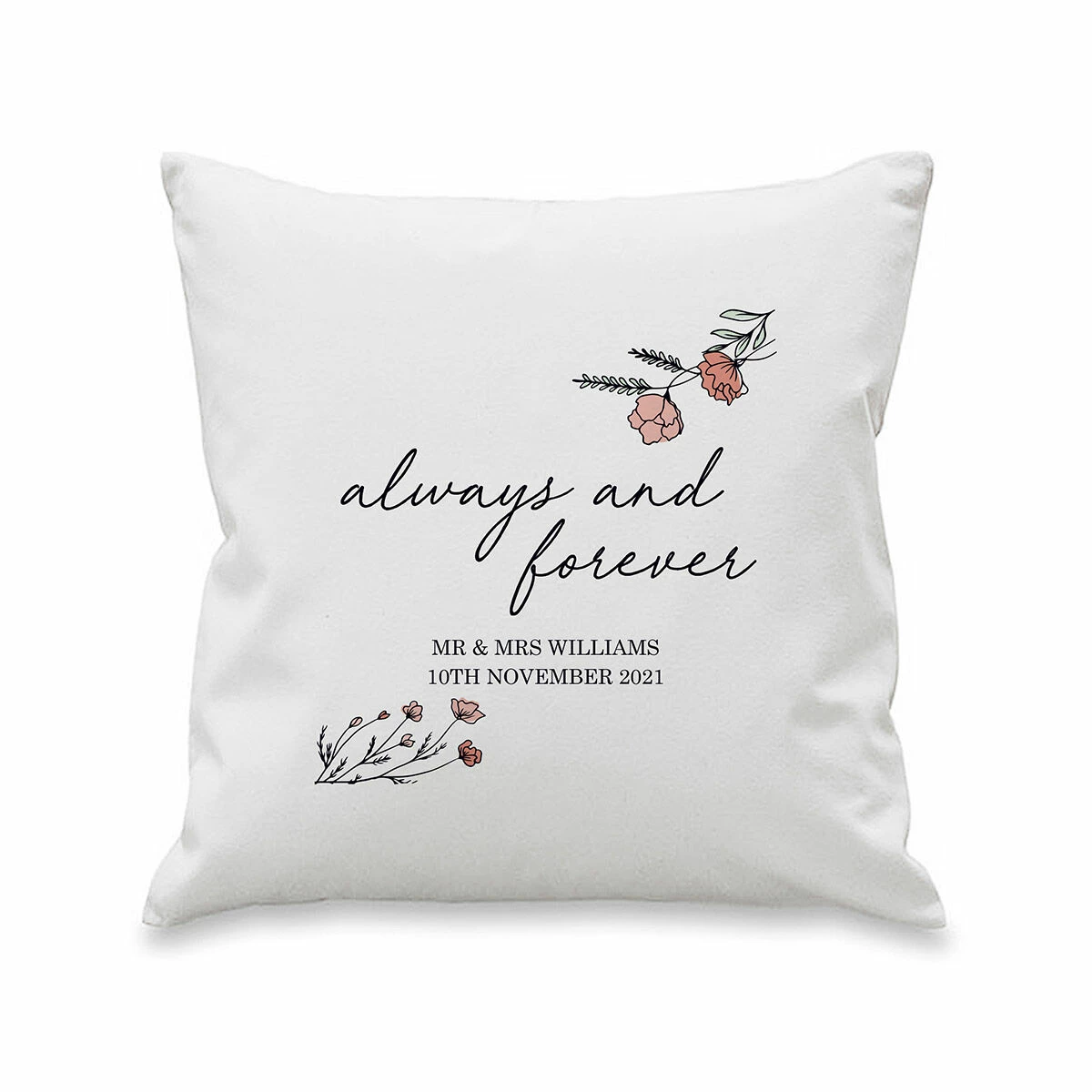 The velvety white cushion is made from 100% cotton, decorated with pink blooms in the corners, along with the words, ‘always and forever’, written in a stylish script font.