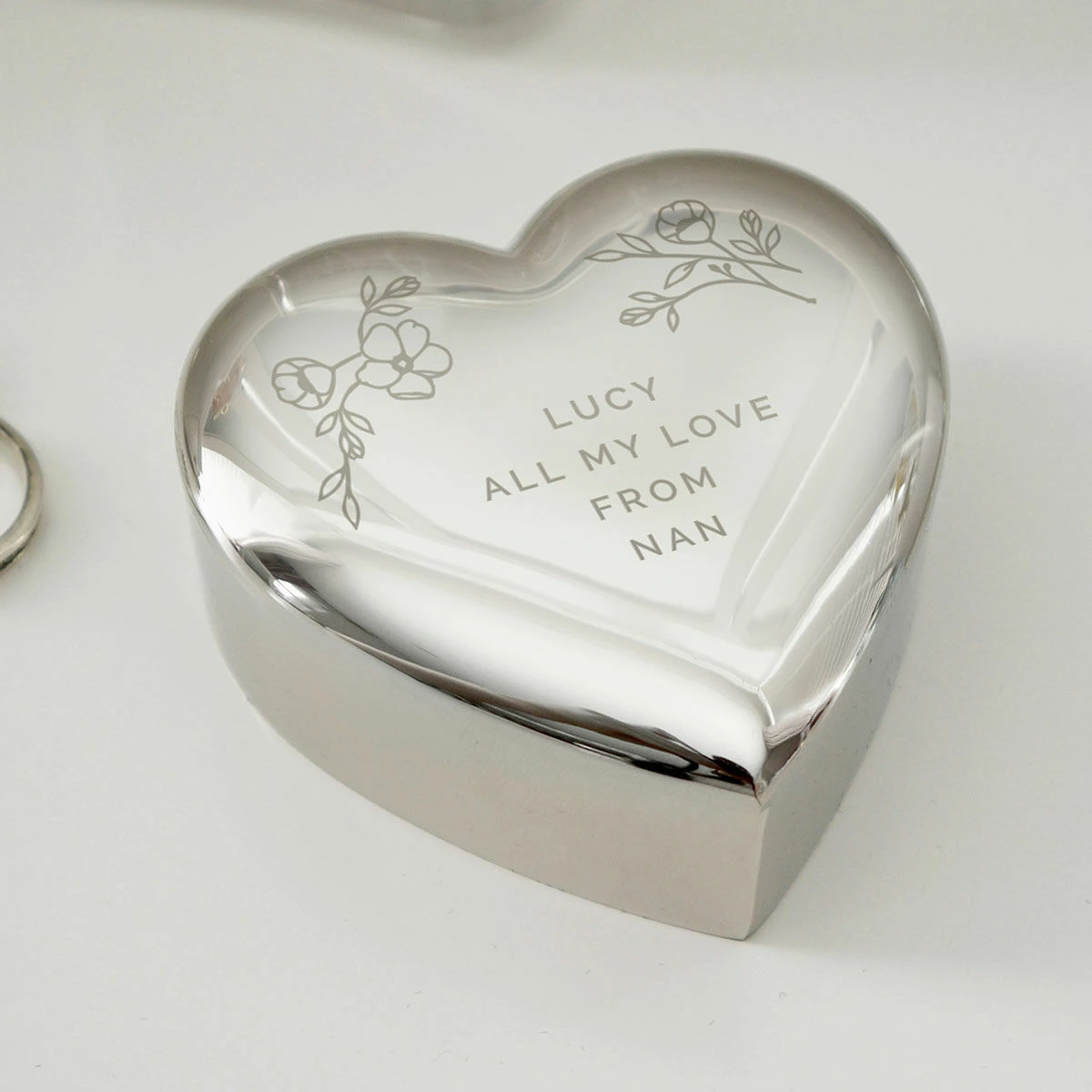 • This beautifully crafted Personalised Floral Free Text Heart Trinket Box is perfect for storing your jewellery, keepsakes, or small treasures. Its elegant design adds a touch of charm to any space.