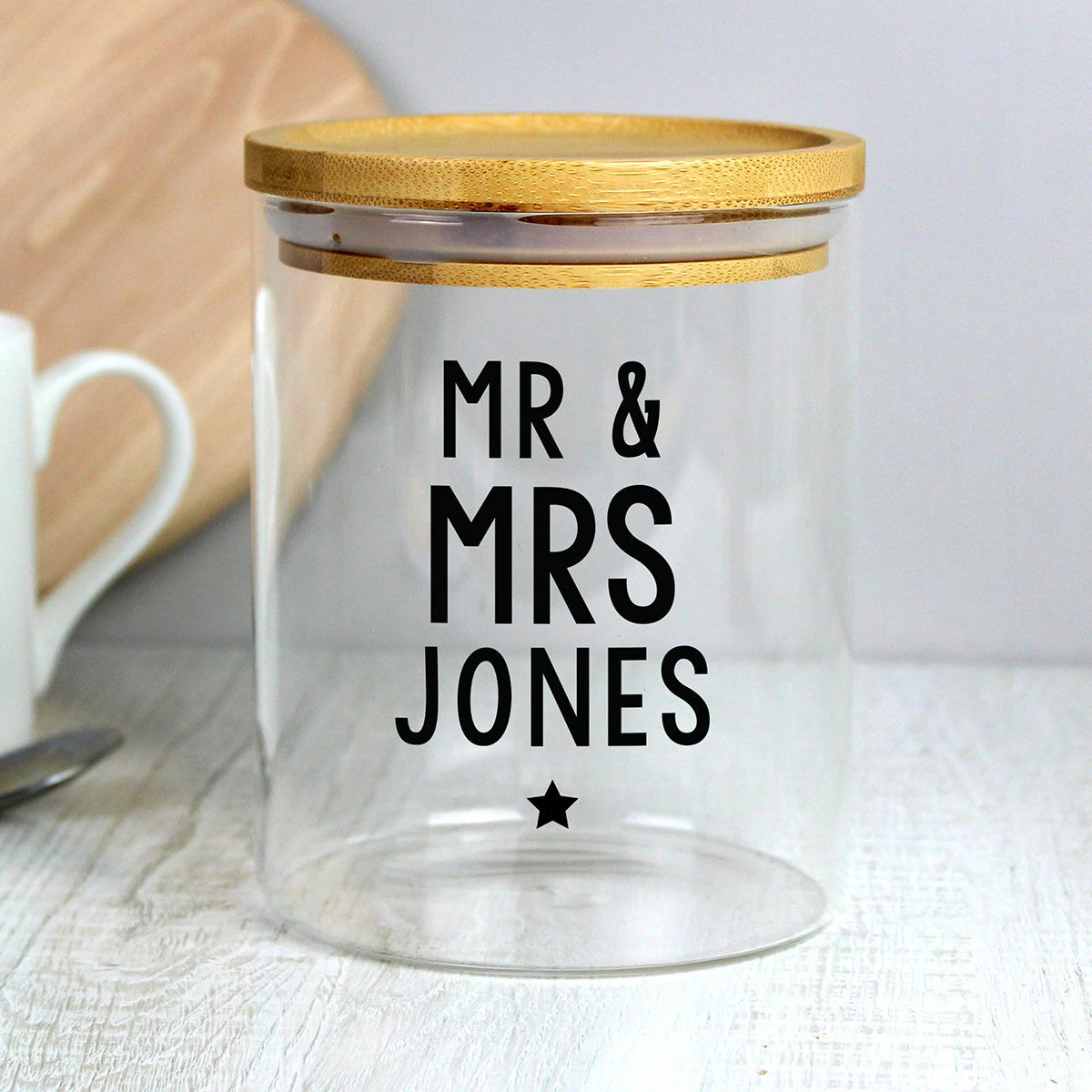 The perfect way to store bits and bobs or your favourite sweet treats, it features a bamboo airtight lid to keep those treats safe and fresh! The glass jar also features black personalisable text in fixed uppercase and a small black star.