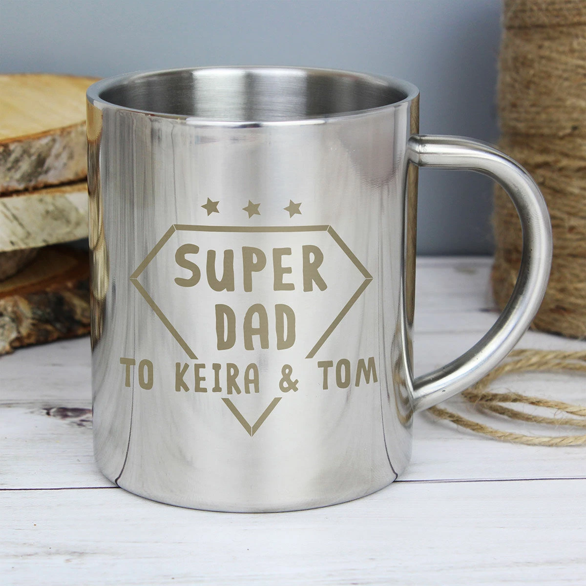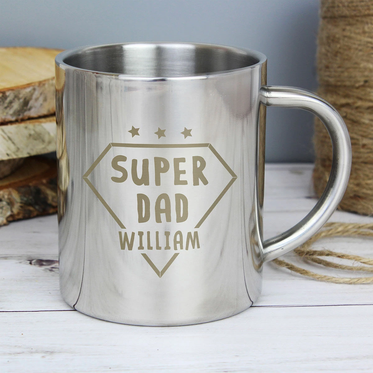 Create the perfect gift for birthdays, Christmas, or Father’s Day with this personalised ‘Super Dad’ Stainless Steel Mug.