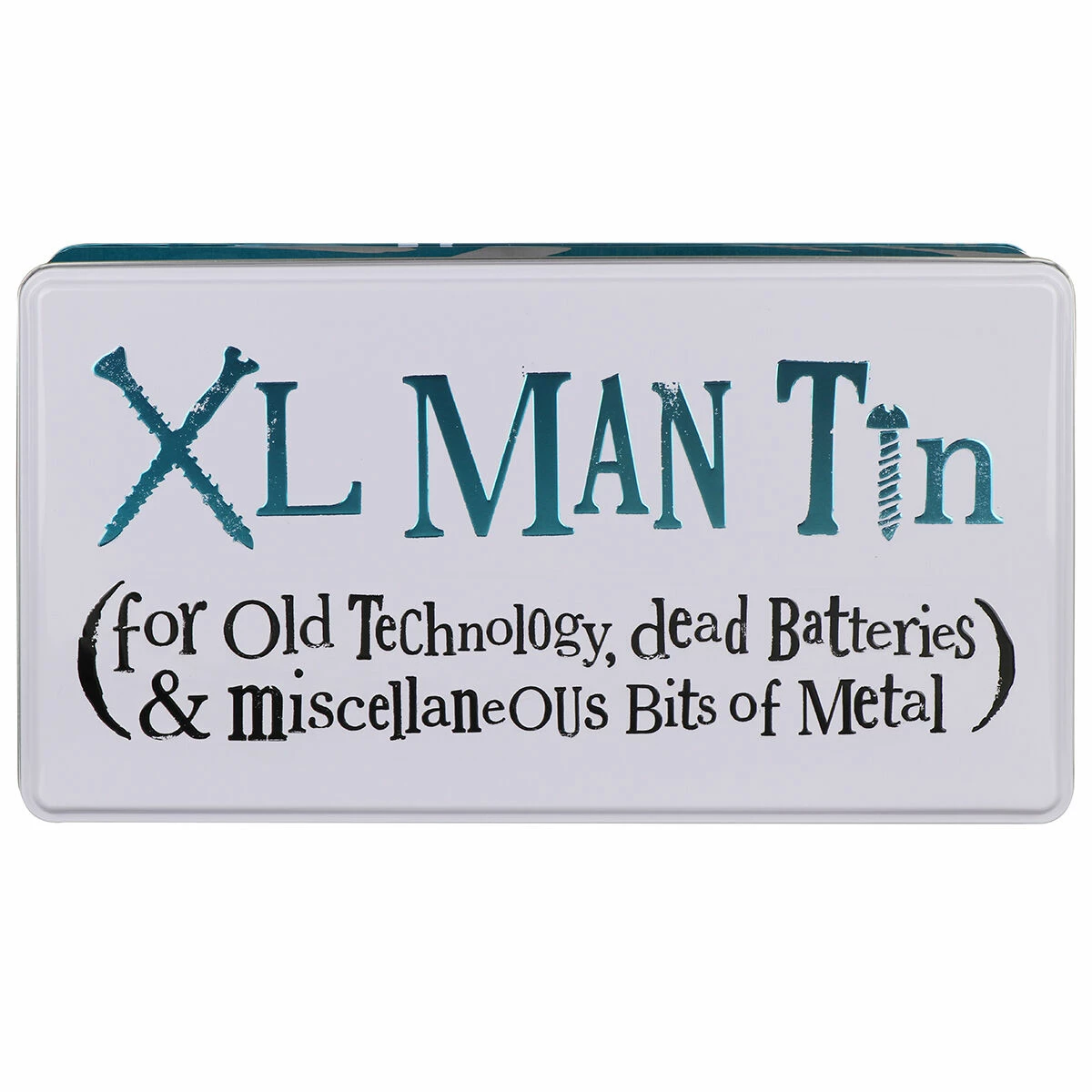 The lid of this grand and spacious tin that reads “XL Man Tin (for Old Technology, dead batteries & miscellaneous bits of metal“. “Man Tin” is written along the sides, while “man Crud Dumping Solution* *I mean storage solution” appears on the bottom.