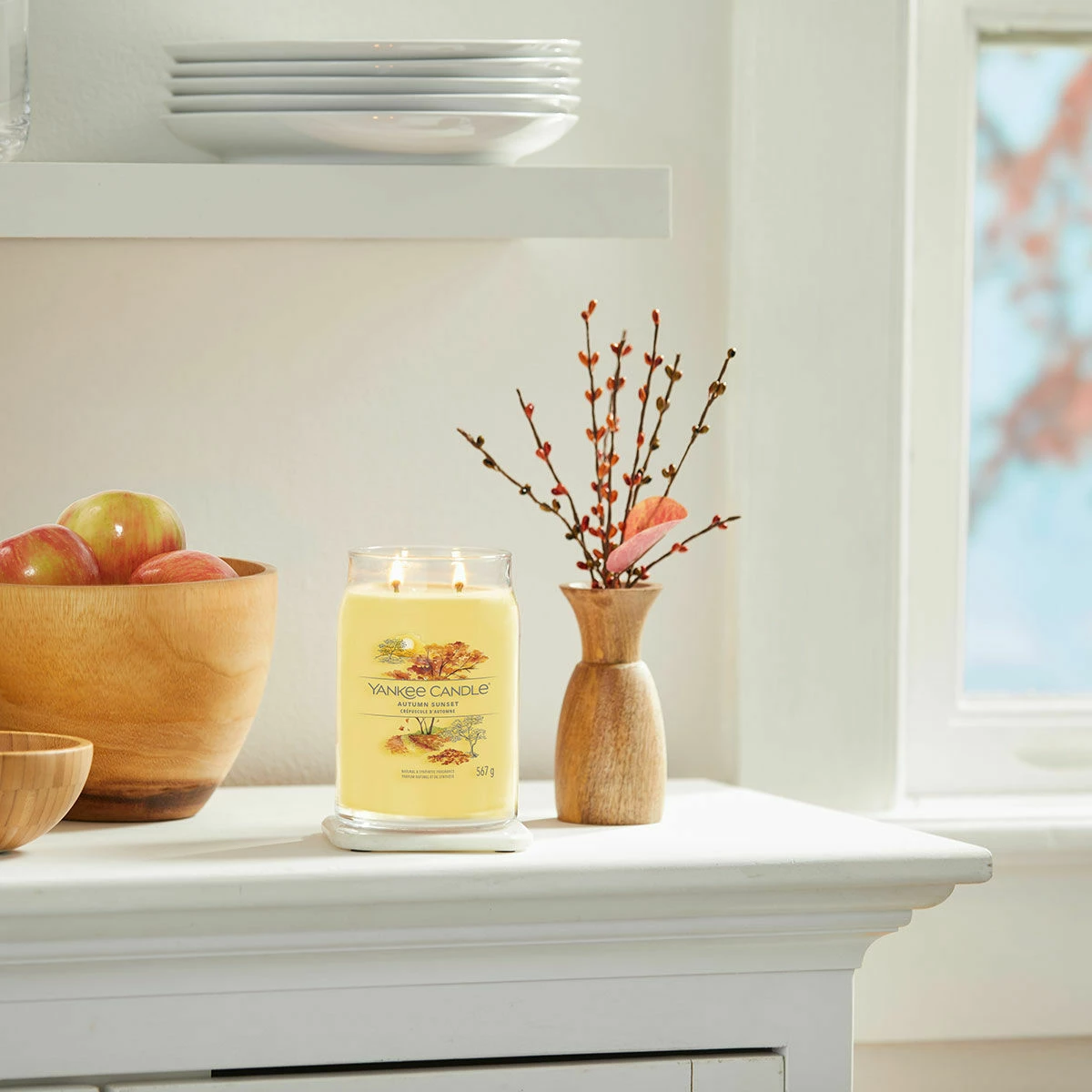 • Experience the warm and inviting scent of autumn with Yankee Candle’s Autumn Sunset Signature Large Jar Candle. This long-lasting fragrance fills your home with the essence of a beautiful sunset.