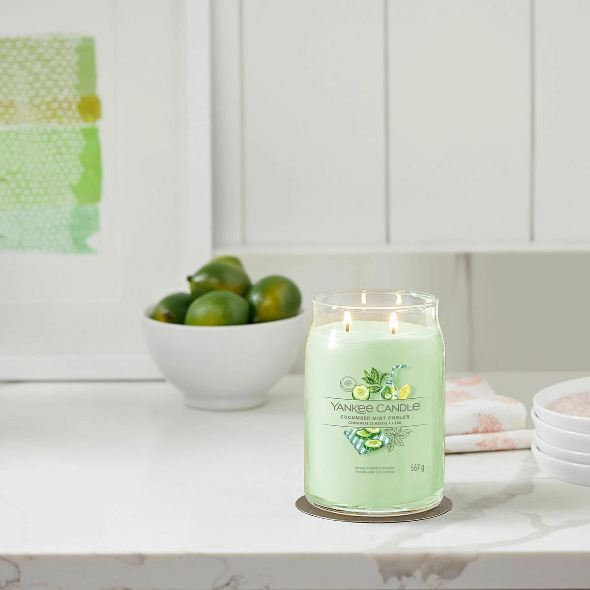 Enjoy the wonderful Cucumber Mint Cooler fragrance in the wonderful Signature Large Jar Candle, a sleek glass vessel that compliments the fragrance and will look wonderful in your home. The wonderful fragrance from Yankee Candle is zesty and fruity, with aromas of refreshing cucumber, lemon and mint intertwining.